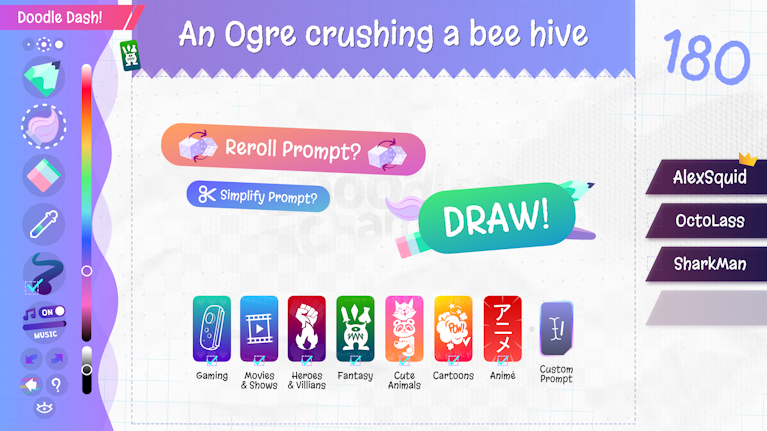 DOODLE DASH! On your marks, get set, DRAW! - Use the Random Prompt Generator to generate random & hilarious prompts to draw with your friends before time runs out! Then choose from 12 unique medals to award your friends, and see what ridiculous awards your creation received. You can post your creations online or save them straight to your device with or without a background! (1-4 players)