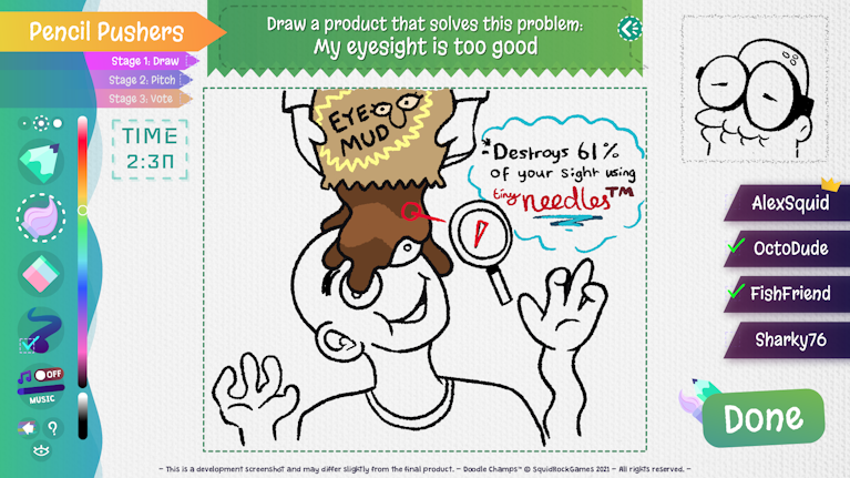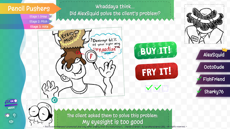 After you've drawn a product that solves your client's problem, you'll have to pitch your product to your friends! Hopefully ya get enough votes to convince the BOSSMAN to buy it... That guy's got a temper.