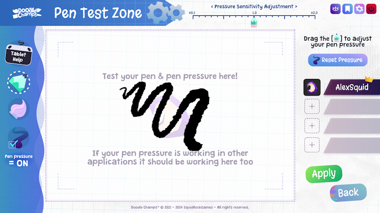 The Pen Test Zone is a feature we designed to ensure that Doodle Champs can be customised to feel good with as many drawing tablet devices as possible. Here you'll be able to adjust the 'pen pressure', which dictates how hard you have to press down to get thick lines. By adjusting the pressure here you can find the perfect fit for your drawing tablet.